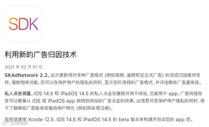 近期,苹果再次推出SKAdNetwork 2.2版本,在原有的对App广告追踪的基础上,开始支持追踪iOS、iPadOS等网页中广告的点击效果,此外,也新增了对View-Through Ads(浏览型广告),包括视频、音频等多种广告形式的归因追踪,开发者可以评估哪些广告最有效、能够推动用户转化 (例如购买或注册),极大程度地减少了即将落地的IDFA访问权限调整的影响。