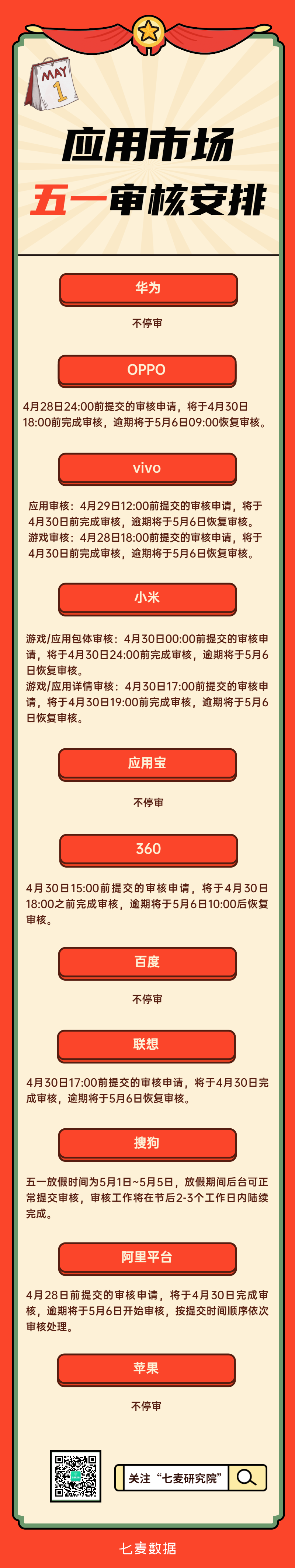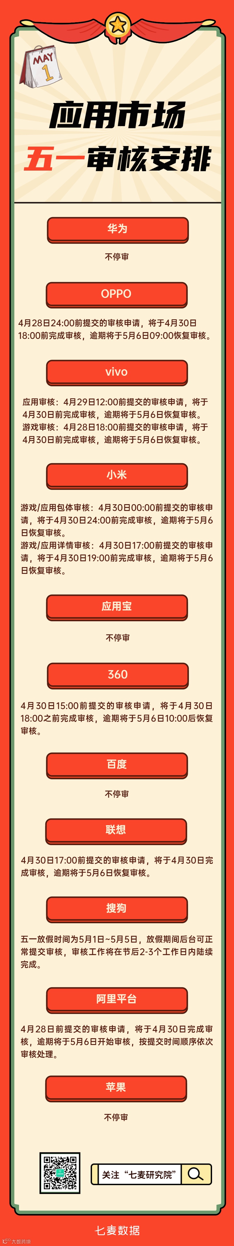 五一小长假临近,很多小伙伴和小编询问各大应用市场假期期间的审核安排,以下是小编整理的官方信息,供大家参考哦~