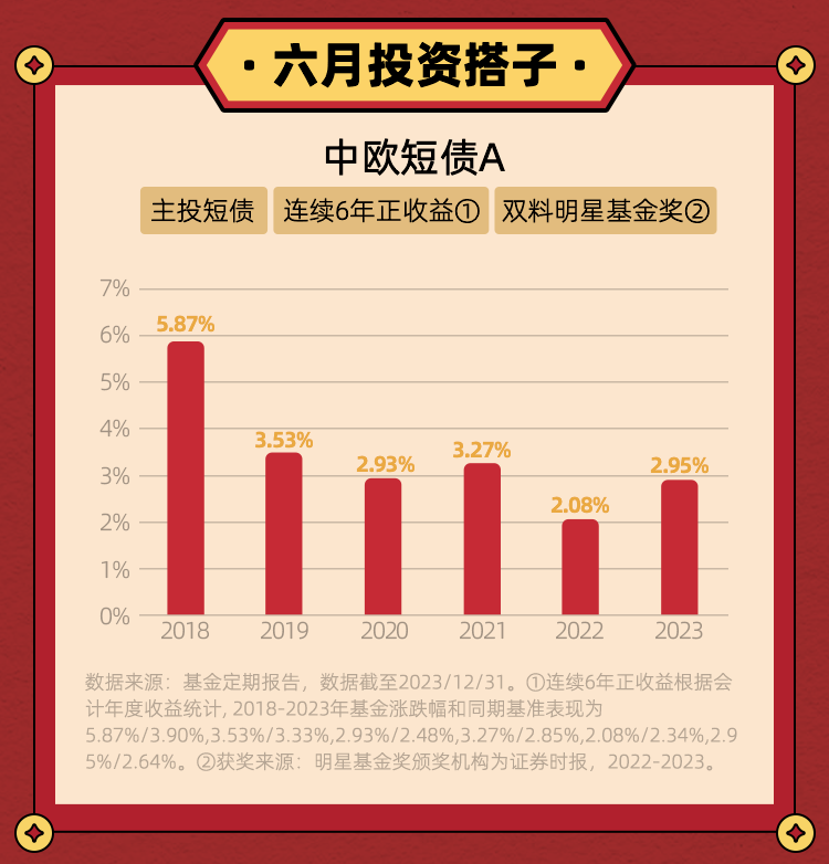 中欧短债A是一只主要投资于剩余期限不超过397天的债券资产的短债基金,由于债券资产久期相对更短,受市场利率波动影响较小。在投资策略上,中欧短债A不激进、不下沉,严控信用风险,力求稳健增值。截至2023年12月31日,中欧短债A连续6年收益为正,和当代年轻人追求“平平淡淡即是福”的理财风格颇为一致。