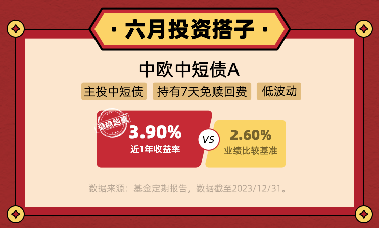 中欧中短债A是一只主要投资于剩余期限不超过3年期债券资产的中短债基金。和中欧短债A类似,由于债券资产的久期较短,受利率变动的影响较低,因此整体风险波动在纯债类基金中更小,颇有“任尔东南西北风”之感。截至2023年12月31日,近一年收益率达3.90%,同期业绩比较基准仅为2.60%。对于风险偏好较低,不喜欢被外界因素过多影响的年轻人来说,也是一款值得关注的产品。同时,中欧中短债在赎回费率设置了持有满7天可免赎回费的优惠,因此让年轻人的申赎更加方便,更符合年轻人“想做就做”的消费习惯。