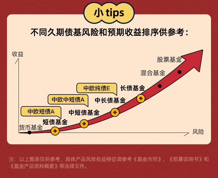以上内容仅供参考,不预示未来表现,也不作为任何投资建议。其中的观点和预测仅代表当时观点,今后可能发生改变。未经同意请勿引用或转载。基金有风险,投资需谨慎。基金管理人承诺以诚实信用、勤勉尽责的原则管理和运用基金资产,但不保证以上基金一定盈利,也不保证最低收益。以上基金的过往业绩并不预示其未来表现,基金管理人管理的其他基金的业绩并不构成基金业绩表现的保证。您在做出投资决策之前,请仔细阅读基金合同、基金招募说明书和基金产品资料概要等产品法律文件和风险揭示书,充分认识以上基金的风险收益特征和产品特性,认真考虑以上基金存在的各项风险因素,并根据自身的投资目的、投资期限、投资经验、资产状况等因素充分考虑自身的风险承受能力,在了解产品情况及销售适当性意见的基础上,理性判断并谨慎做出投资决策。以上基金为债券型基金,其预期收益及预期风险水平高于货币市场基金,但低于混合型基金、股票型基金。