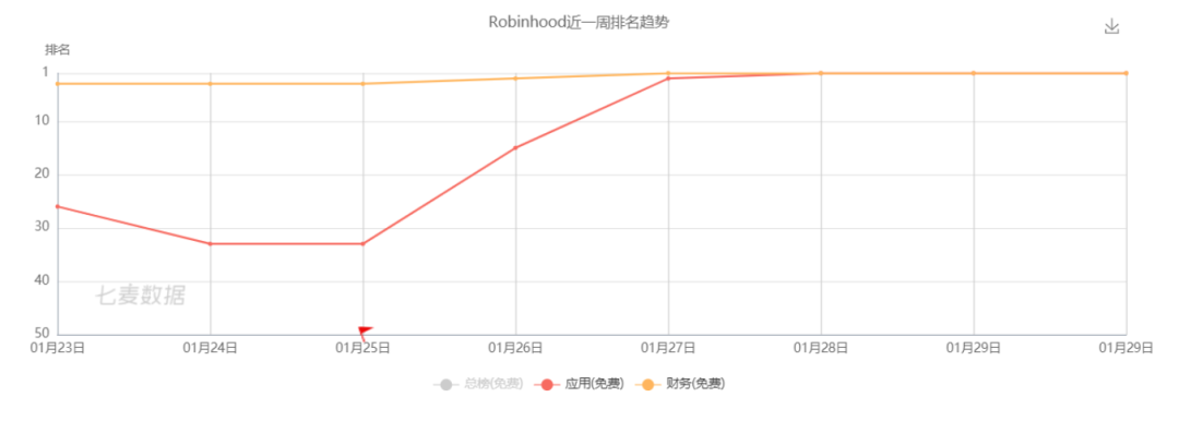 最受美国散户欢迎的炒股平台Robinhood在App Store美国区榜单排名表现亮眼,从25日开始其在应用总榜一直保持上升趋势,28日更是霸占Top1位置,并保持至今。