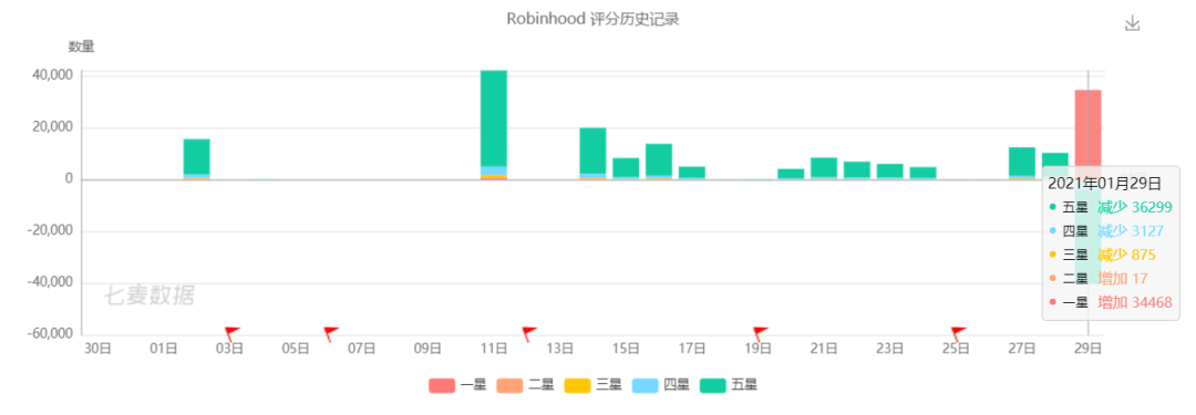 1月29日,Robinhood在App Store收获了3万多条一星差评,3.6万条五星好评被取消。