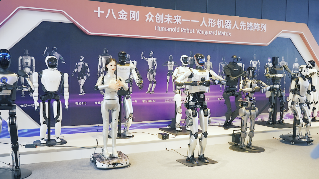 在展馆入口附近就可以看到一个“十八金刚”人形机器人列阵,18台采用不同技术架构的人形机器人通过控制实现动态协同完成统一动作,吸引了众人的目光。