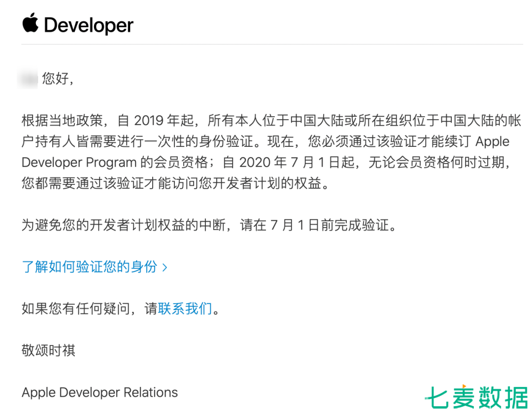 根据邮件内容显示,自 2020 年 7 月 1 日起,无论会员资格何时过期,所有本人位于中国大陆或所在组织位于中国大陆的帐户持有人都需要进行一次性的身份验证,才能续订 Apple Developer Program 的会员资格,以及访问开发者计划的相关权益。