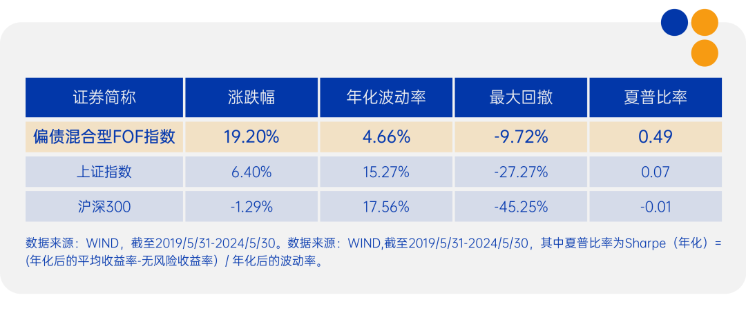 数据显示,近五年偏债混合型FOF指数涨跌幅19.38%,年化波动率4.66%,最大回撤-9.72%,夏普利率0.49。相较于同期沪深300及上证指数,从涨跌幅、年化波动率、最大回撤等方面确实均具备一定优势。