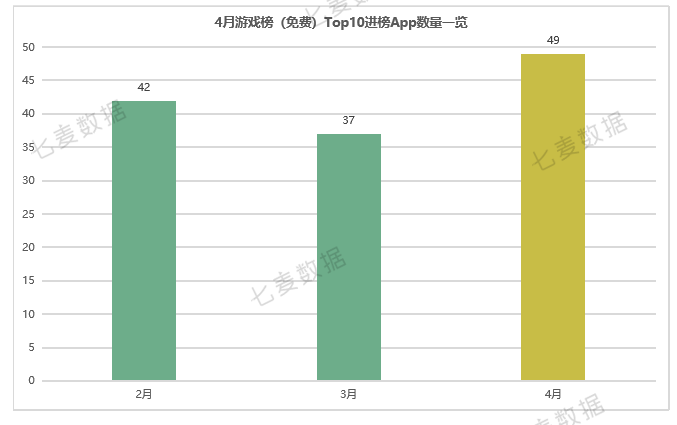 4月,共有49款游戏曾先后进入游戏免费榜 Top10 以内,与前两月相比,4月进榜App的数量有所提升。