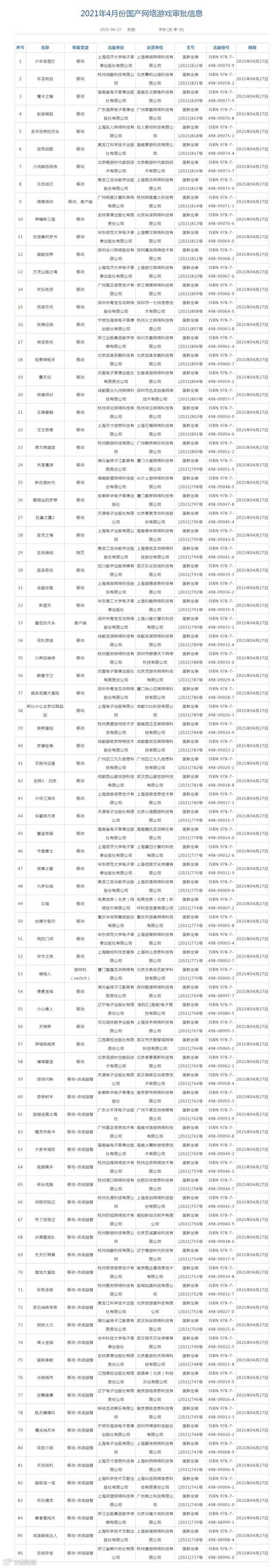 2021年4月,国家新闻出版署官网一共公布了86款过审游戏,其中移动游戏占83款。同时,这也是《游戏审查评分细则》自4月1日起正式试行以来的首批国产网络游戏审批消息。可点击《4月1日起游戏审查试行评分制,低分游戏将被打回!》了解具体的评分规则。