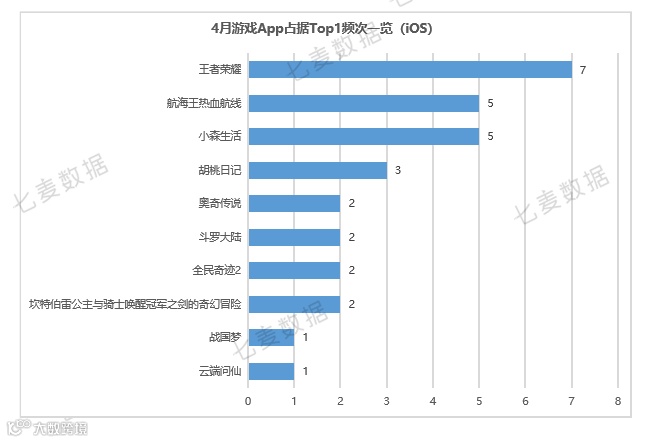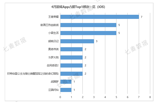 从榜单排名竞争来看,「王者荣耀」在3月接连7次登上Top1宝座,霸榜次数最多,其次,「航海王热血航线」以及「小森生活」分别5次登上游戏免费榜Top1。