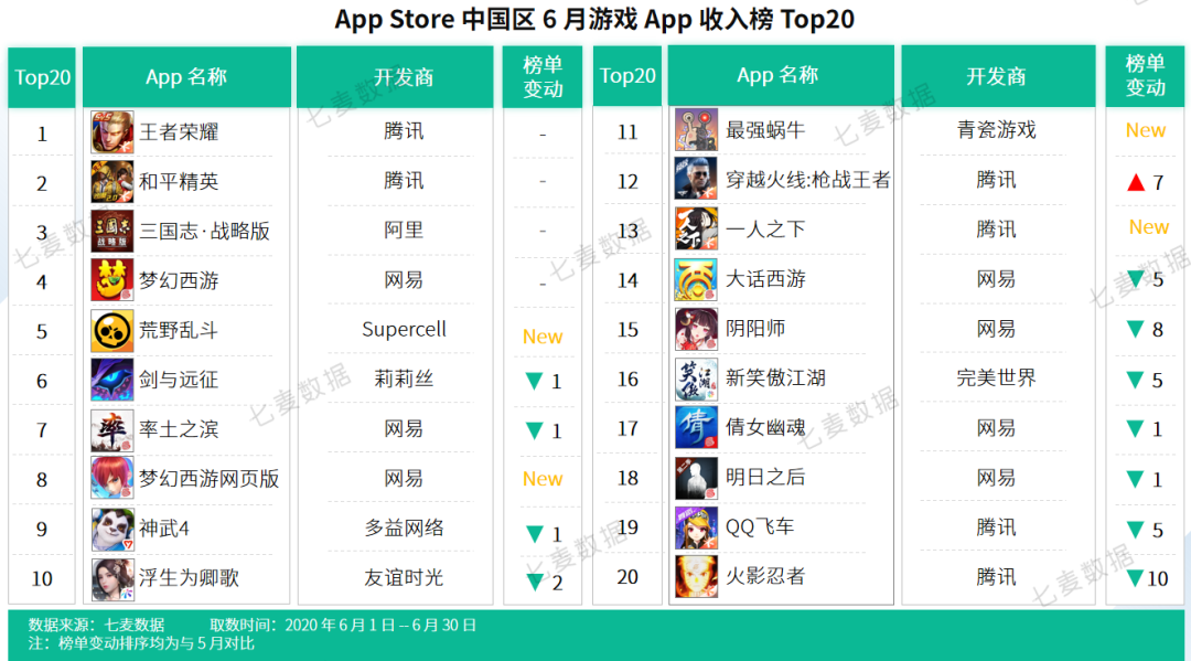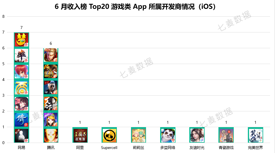 6 月游戏 App 收入榜 Top20 被网易、腾讯、阿里、Supercell、莉莉丝、多益网络、友谊时光、青瓷游戏、完美世界 9 个厂商包揽。