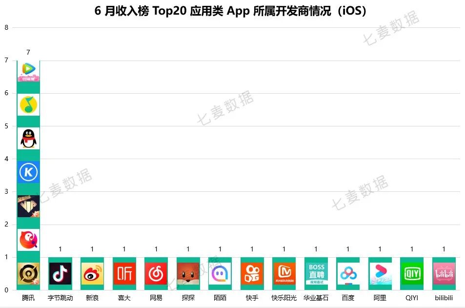 在 6 月的应用收入榜 Top20 中,腾讯依然成为了月度上榜产品最多的开发商,共计 7 款应用在榜,总占比达 35%,分别是腾讯视频、QQ音乐、QQ、酷狗音乐、心悦俱乐部、全民K歌、王者营地,而其他 13 家厂商均只有一款产品在榜。
