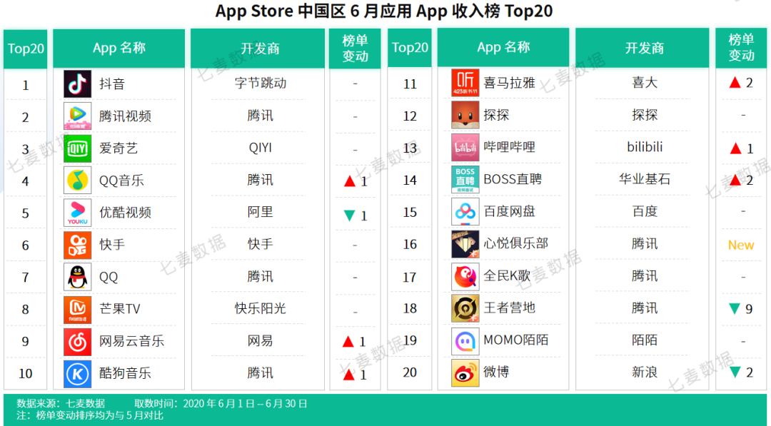 《中国区 6 月应用 App 收入榜 Top20》中,抖音、腾讯视频、爱奇艺占据前三甲,且产品排名已连续三个月保持稳定;QQ音乐、网易云音乐、酷狗音乐、喜马拉雅、哔哩哔哩、Boss直聘 6 款产品排名均有小幅上升;腾讯旗下的游戏福利平台心悦俱乐部则是 6 月唯一一款新上榜产品,位列 Top16。