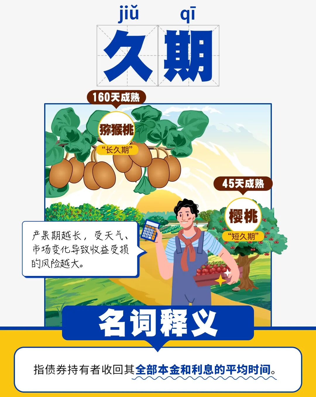 久期,指的是债券持有者收回全部本金和利息的平均时间。久期越长,说明债券离到期时间就越长,受市场利率的影响也越大。久期越短,说明债券很快就会到期,受市场利率的影响就越小。