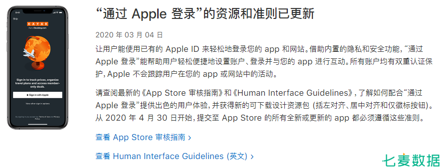 今年 3 月 4 日,苹果更新《App Store审核指南》时,对其条款 4.8 Sign in with Apple (通过 Apple 登录)也进行了修改,明确表示开发者需要在 App 登录界面增加“通过 Apple 登录”的方式,同时也更新了《Human Interface Guidelines》页面,帮助开发者以更佳、更全面的方式为用户设置通过 Apple 登录。