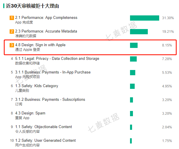 近日,七麦研究院观察到,在近 30 天审核被拒十大理由中,“4.8 通过 Apple 登录”开始出现在名单之中,且排名和占比还在不断上升。截止发稿前,该项条款已排在近 30 天审核被拒十大理由的第 3 名,占比达 8.15%。从历史数据中发现,这种现象是从 7 月开始出现。