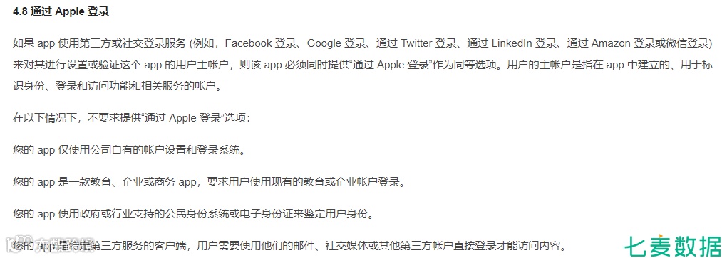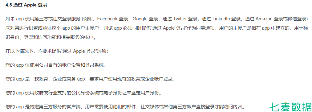 “4.8 通过 Apple 登录”其实是 App Store 审核指南中的一项条款,具体要求为:如果 App 使用第三方或社交登录服务 (例如,Facebook 登录、Google 登录、通过 Twitter 登录、通过 LinkedIn 登录、通过 Amazon 登录或微信登录) 来对其进行设置或验证这个 App 的用户主帐户,则该 App 必须同时提供“通过 Apple 登录”作为同等选项。用户的主帐户是指在 App 中建立的、用于标识身份、登录和访问功能和相关服务的帐户。