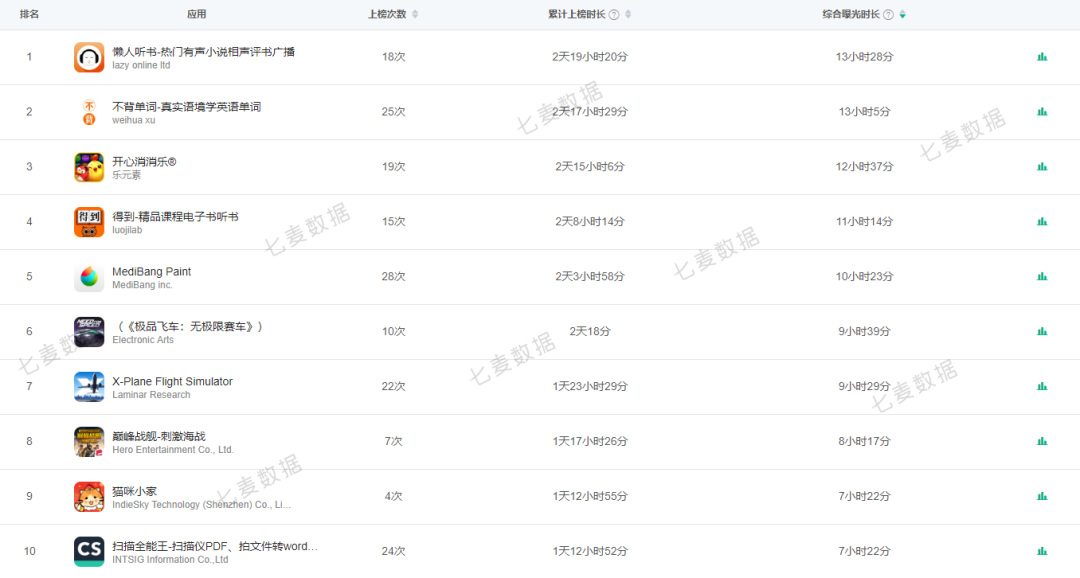 上周一共有 288 款 App 登上热搜,数量较前一周相比减少了 19 款,相对较为稳定。其中,「懒人听书」累计上榜时长最多,共计 2 天 19 小时 20 分;热搜榜 Top10 产品中,游戏产品占据 5 款,图书类产品占据 2 款,参考、娱乐、效率类 App 各有 1 款。