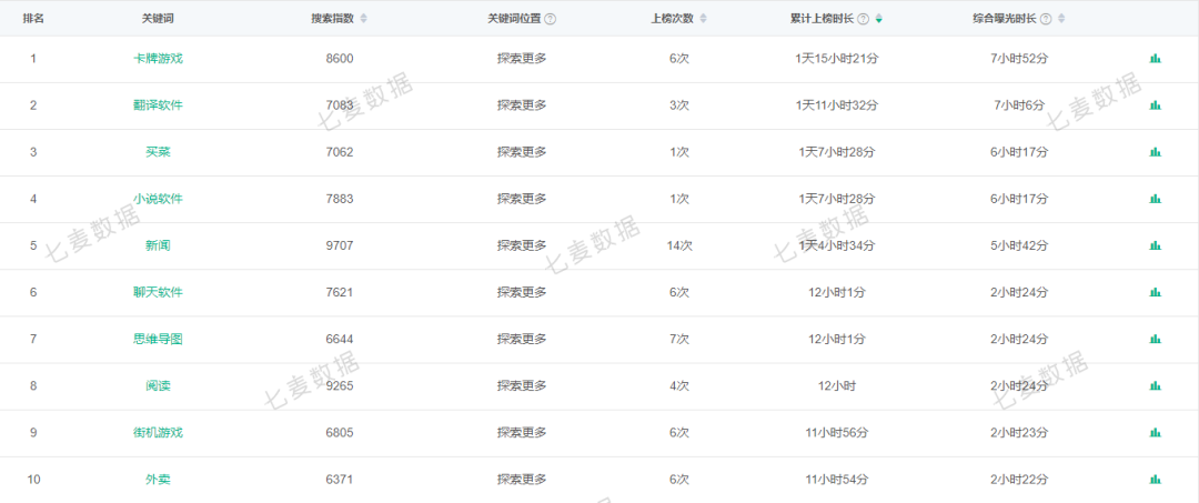 上周一共有 98 个热搜关键词,其中“卡牌游戏”排名第一,累计上榜时长达 1 天 15 小时 21 分。“翻译软件”、“买菜”、“小说软件”、“新闻”、“聊天软件”、“思维导图”、“阅读”、“街机游戏”、“外卖”也是上榜时长较多的关键词。