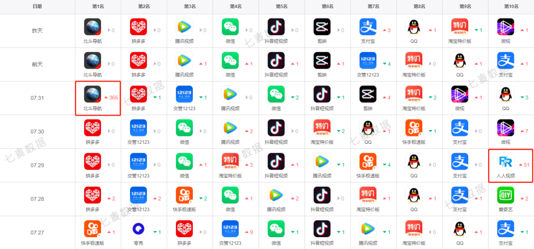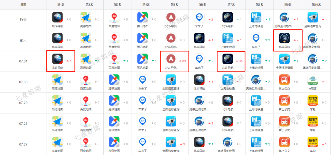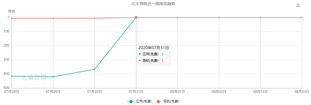 据七麦研究院观察,7 月 31 日,也就是官方发布北斗导航系统圆满成功的当天,多款产品名称为“北斗导航”的 App 在导航分类榜中的排名以及 App 下载量都出现了明显的攀升。