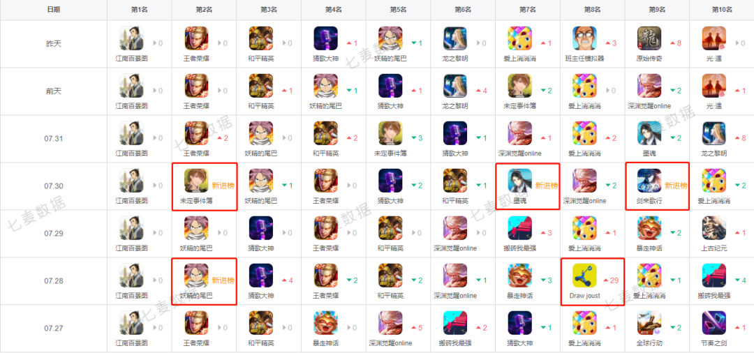 而在上周的游戏免费榜 Top10 中,共计入围 20 款产品,游戏产品的排名波动都处于小幅波动的情况。上周游戏免费榜 Top10 中一共出现了「未定事件簿」、「妖精的尾巴:无尽冒险」、「墨魂」、「剑来歌行」4 款新进榜产品,且均是在预订转上架后的不久便入围游戏免费榜 Top10。Voodoo 旗下的「Draw joust」也在上周有着不错的表现,周二单日排名上升 29 位,但随后该产品在周三下架。