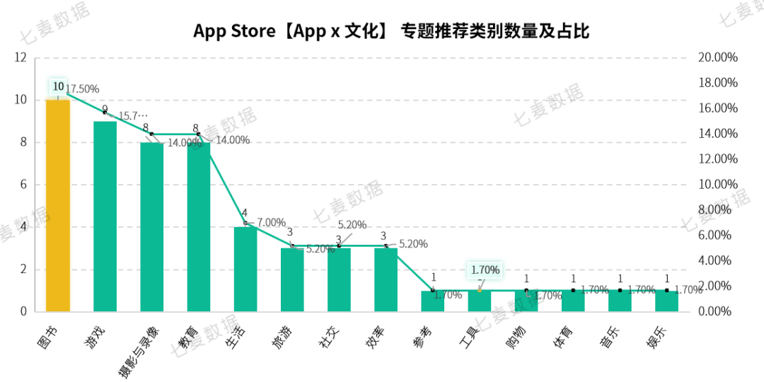 【App×文化】专题共推荐 14 种类别的产品,其中图书类 App 数量最多为 10 款,占比 17.5%,游戏类、摄影与录像类、教育类紧随其后,参考、工具、购物、体育、音乐、娱乐类推荐 App 数量较少。