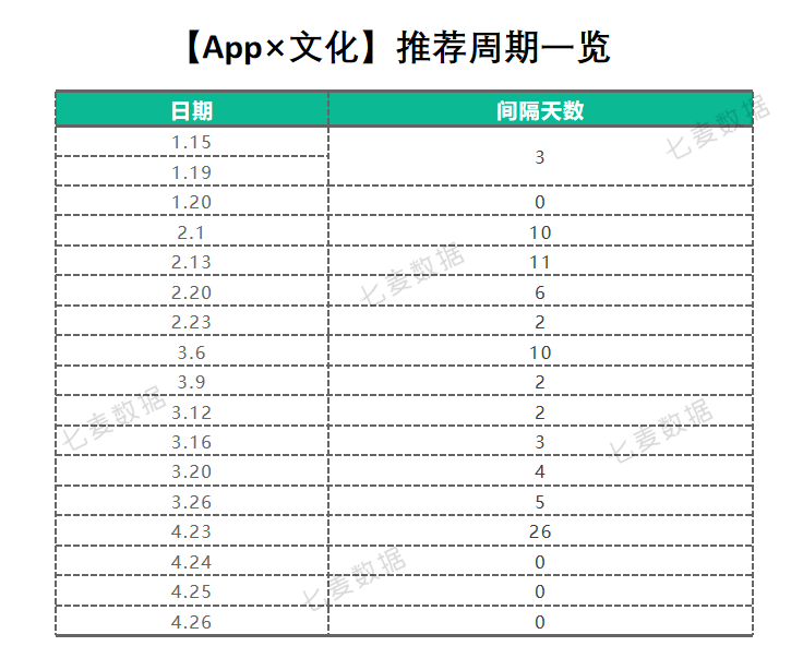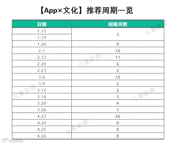 从推荐周期间隔来看,间隔最短的为 0 天,即 App Store 连续 2 天推荐了【App×文化】专题,且推荐内容不同,最长的为 27 天,两次推荐间隔通常来说在一周左右。其中有 2 个专题与节日有关,一个是 1 月 19 日 - 1 月 20 日推荐专题都与春节有关,另一个是 4 月 23 日 - 4 月 26 日连续 4 天为世界读书日推荐图书 App。