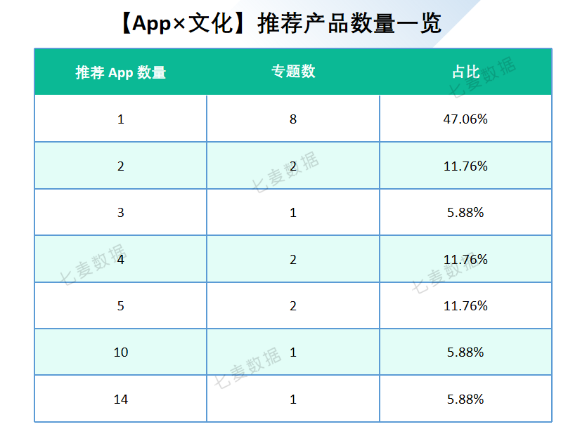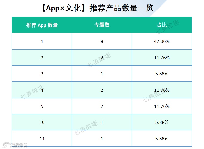 在取数周期内,【App×文化】共推荐了 17 个专题,57 款 App。其中推荐 1 款 App 的专题数量最多,共 8 个,占比近一半;其次为推荐 2 款、4 款、5 款的专题,数量均为 2 个,推荐 3 款、10 款和 14 款 App 的专题数量最少,分别只有 1 个。