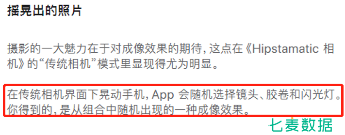苹果在 3 月 12 日的【App×文化】专题中对 Hipatamatic 相机进行了推荐,并在推荐文案中描述“在传统相机界面下晃动手机,App 会随机选择镜头、胶卷和闪光灯。你得到的,是从组合中随机出现的一种成像效果。”也就是说,使用该相机 App 拍摄照片,成像效果是随机的、不确定的。