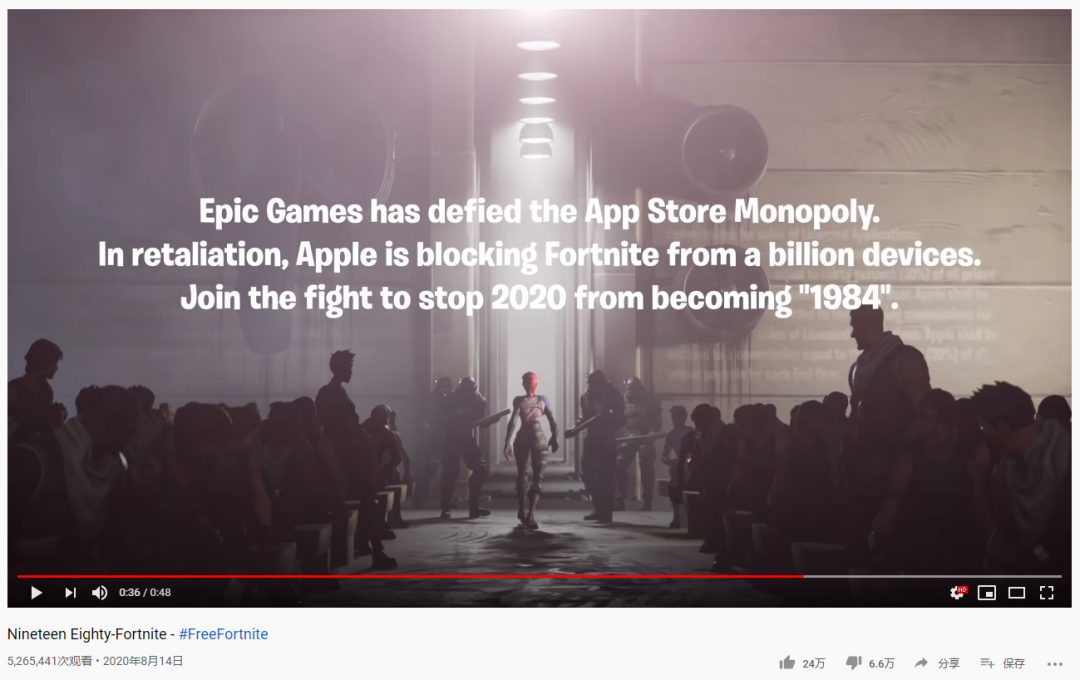 按照惯例,处于强势地位的苹果在对 App 采取下架措施后,违规产品的开发商出于止损需要,往往以整改服软收尾。但 Epic Games 针对此次苹果的下架行为并没有选择默默接受,而是在当天便准备了一份长达 60 多页的诉讼书对苹果公司提起了诉讼。并以#FreeFronite为话题,发起一场声势浩大的社交媒体运动,并且在 YouTube 和「堡垒之夜」游戏内发布了一则视频,模仿苹果知名的"1984"Macintosh 广告,鼓励「堡垒之夜」的玩家对苹果进行“回击”。