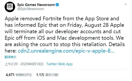 8 月 17 日,Epic Games发布公告称,苹果不仅将「堡垒之夜」从 App Store 上移除,还告知 Epic Games 将会从 8 月 28 日起停用 Epic Games 所有开发者的账号,切断 Epic Games 对 iOS 和 Mac 端开发工具的访问权限。