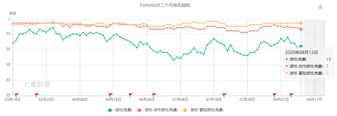 七麦数据显示,以美国区为例,在近三个月的 App Store 游戏免费榜排名中,「堡垒之夜」一直稳定保持在 Top30 以内的位置,在遭遇下架前的最后一天,「堡垒之夜」还保持在游戏免费榜 Top18 的位置。