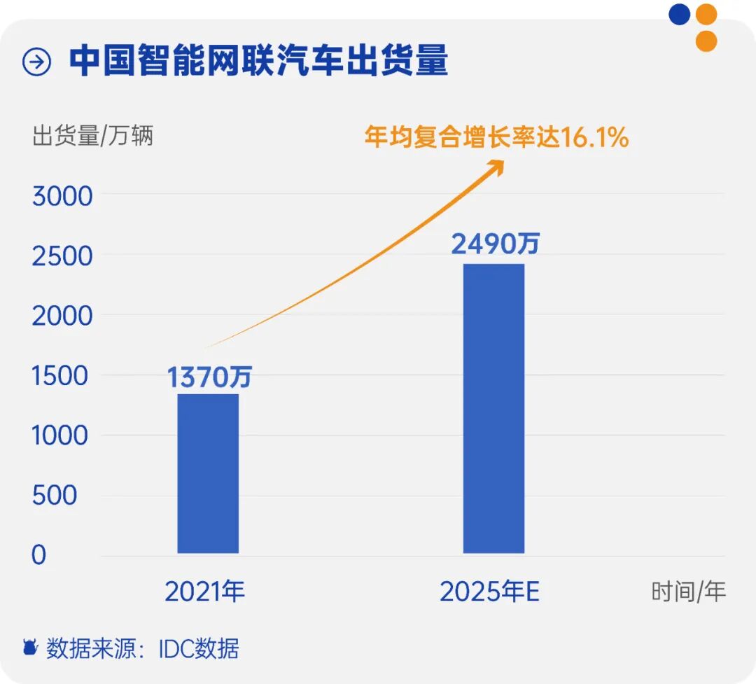得益于国家政策支持和技术储备,中国汽车智能化布局位于世界前列。根据IDC数据,中国智能网联汽车出货量将由2021年的1370万辆增长至2025年的2490万辆,年均复合增长率达16.1%,发展前景广阔。