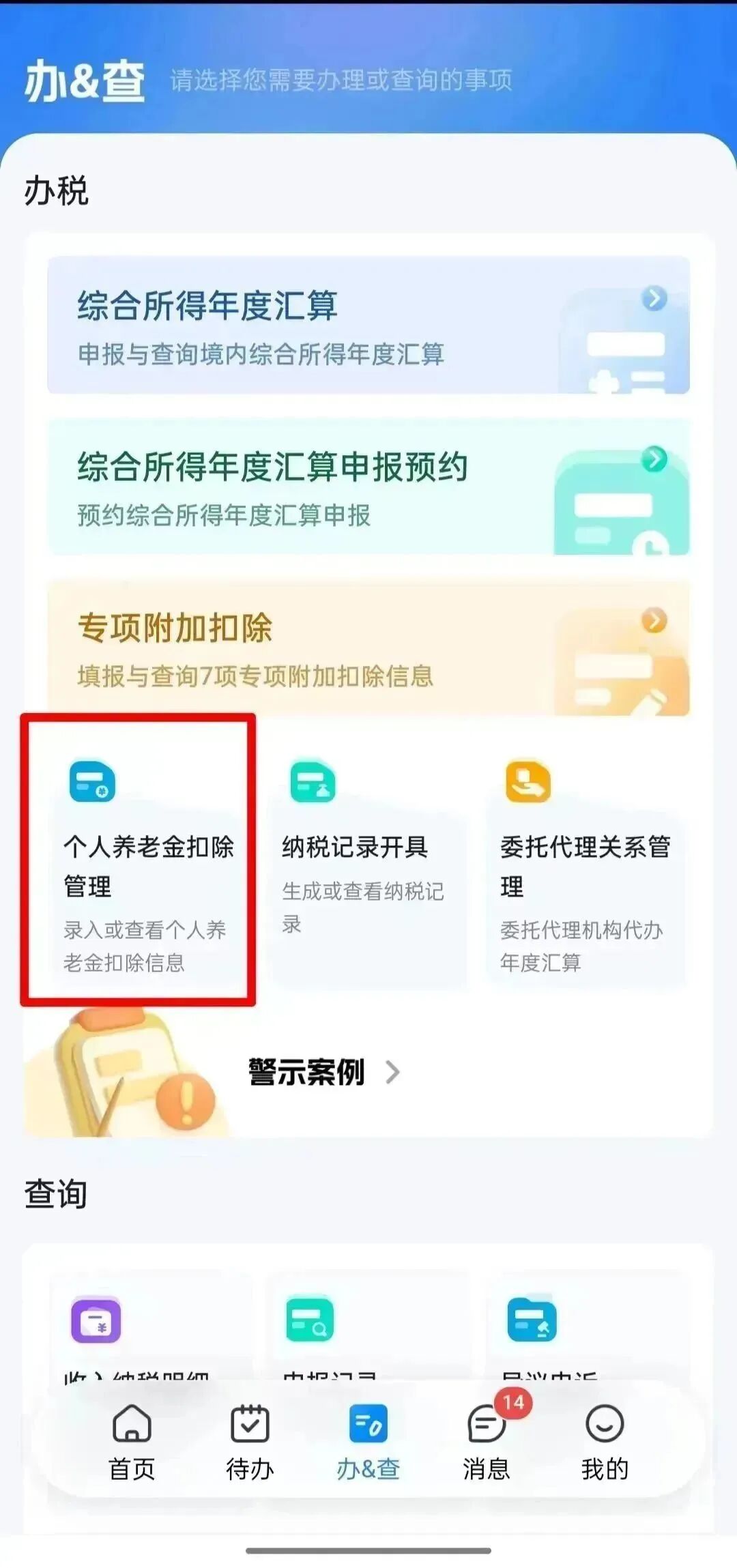 01. 下载个人所得税APP后,登录个人账户,打开APP选择【办&查】【个人养老扣除管理】