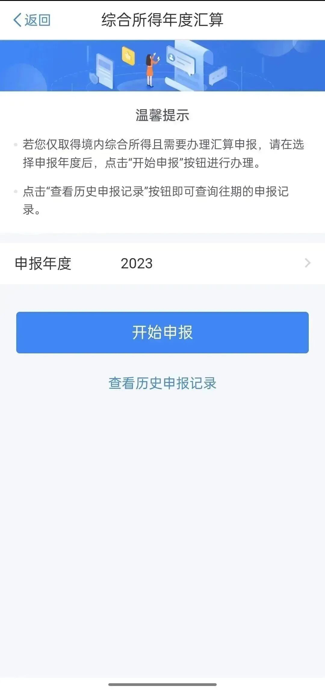 03. 选择【申报年度】(2023年度),点击【开始申报】并根据流程指引完成个税汇算清缴