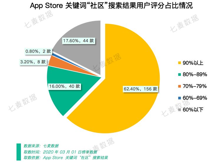 从用户对社区产品评分情况来看,社区类产品整体评分情况较好,有 64.4% 的 App 好评率在 90% 以上,用户满意度较高,但也有 17.6% 的 App 受到用户差评,评分未达到及格线。主要原因集中于,过度请求收集用户数据、涉嫌用户隐私泄露、平台内容负能量、娱乐性质过于强烈等等。