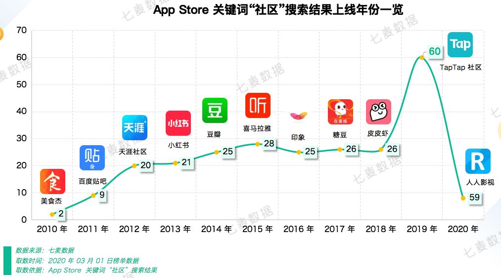 近年来,随着移动互联网普及程度越来越高,与用户关系密切的社交、社区产品纷纷涌现。七麦数据显示,从 App Store 中搜索关键词“社区”,相关产品从 2019 年起大量激增,一年上架 60 款产品,较 2018 年翻了 2.3 倍,以游戏为主的「TapTap 社区」、综合类社区产品「飞聊」就是在这一年上线。