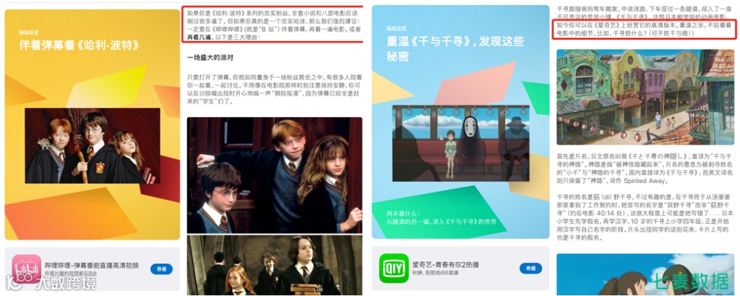 在对哔哩哔哩和爱奇艺的推荐中,推荐文案说明了该产品可以观看知名影视作品,并有自己的特色,比如在爱奇艺的推荐中,文案表示爱奇艺可以观看《千与千寻》的高清版本,而在哔哩哔哩的推荐中,文案则表示建议用户在 B站中伴着弹幕观看《哈利波特》,会有另一番体验。