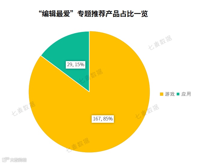 该专题共推荐了 196 款 App,其中游戏数量对比应用呈压倒性的优势,共 167 款,占比 85%,而应用仅 29 款,占比 15%。