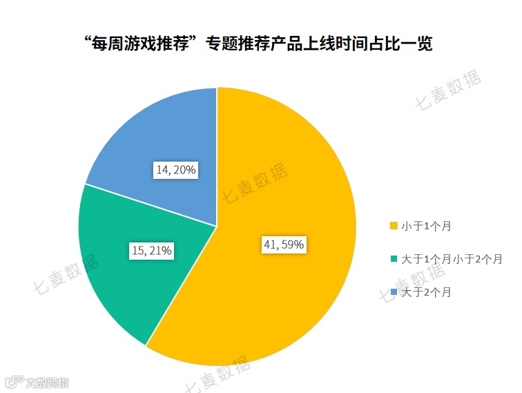 同时,七麦研究院通过整理发现,有 41 款是推荐时间近 1 月上线的产品(例:如 4 月 26 日进行每周新游推荐,则统计推荐产品中,自 3 月 26 日 - 4 月 26 日上线的产品),占比 59%,而上线时间大于 1 个月,小于 2 个月的产品有 15 款,占比 21%。