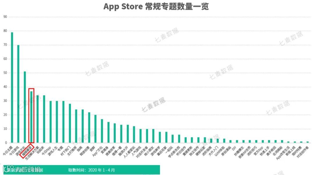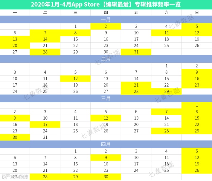 因此,开发者获得编辑推荐相对概率较高,且对于用户增长的优势不言而喻。七麦研究院提取了 2020 年 1 月 1 日 — 2020 年 4 月 30 日,中国区 App Store “Today”推荐的“编辑最爱”专题相关数据,为大家解析该专题背后的推荐逻辑。