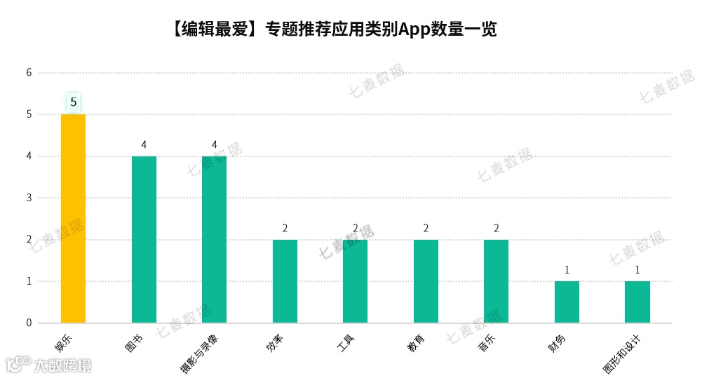 “编辑最爱”专题共推荐了 9 种类别的应用,其中娱乐类 App 数量最多为 5 款,占比 17.2%,图书、摄影与录像类紧随其后,占比 13.8%,效率、工具、教育、财务、图形和设计类推荐 App 数量较少。