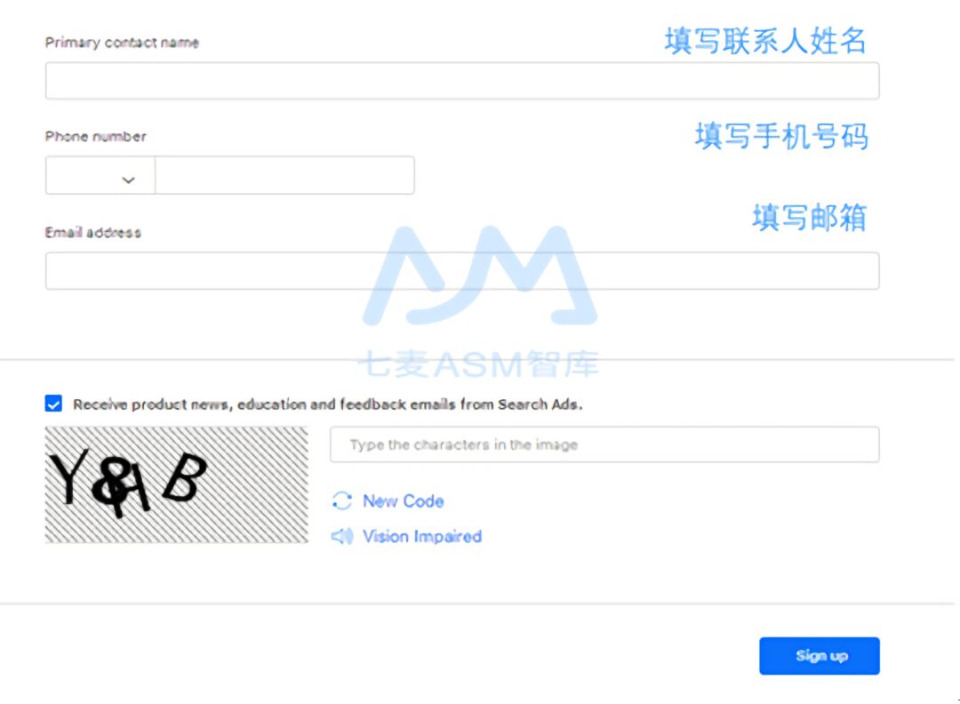 联系人信息中需要填写主要联系人姓名、手机号和邮箱,勾选接受 Search Ads 发送的反馈邮件后填写图中验证码。