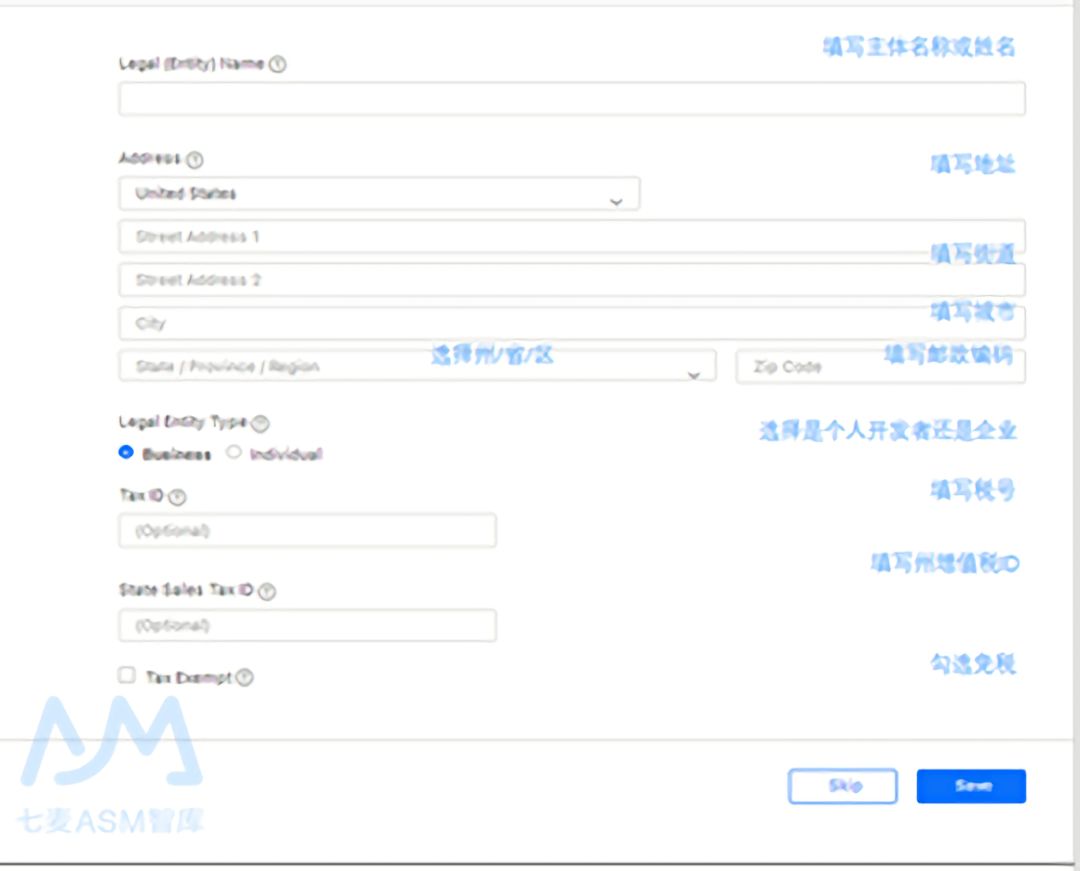 账号创建成功后还需要填写一些详细信息,其中业务详细信息页面需要填写主体名称或开发者姓名、地址和税号。