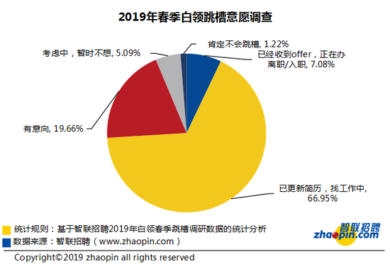 智联招聘发布的《2019 春季跳槽报告》中,指出 2019 年春季有 74.03% 的白领有跳槽行动,还有 19.66% 的白领虽然心动了但还没付诸行动。