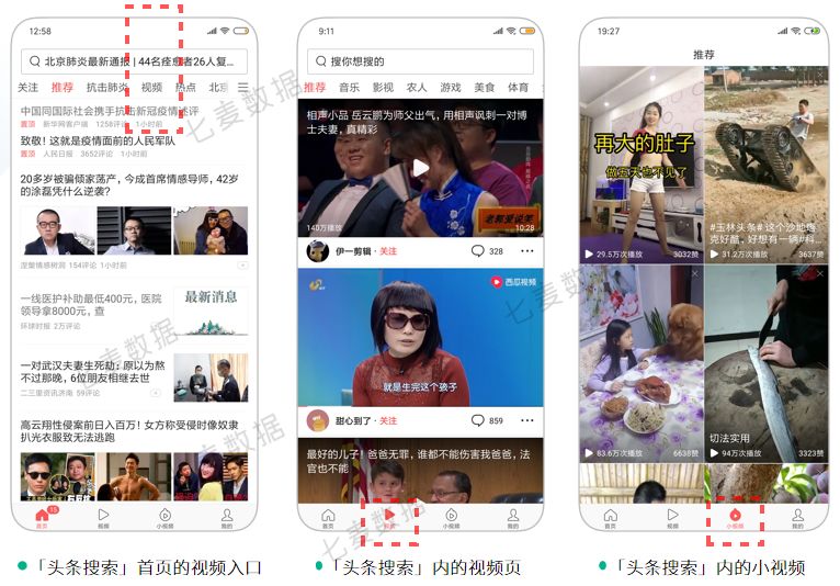 可以看出,头条搜索在产品中嵌入抖音、抖音火山版、西瓜视频多个已成为字节系众多产品中带量王的流量头目,其目的与作用也十分明显,为产品提高知名度的同时,也为头条搜索注入了稳定的视频资源。