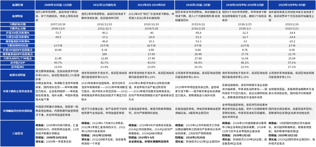 复盘市场过去几次底部来看,能够得出一个结论,引发市场见底并反转的共同特征是前期导致市场调整的因素出现转向或者是预期上的边际改善。这就是我们要观察的“拐点”,信号就来自于前文所述的基本面、政策、估值、资金、行为和外部因素这 6 种信号。如果某些因素出现改善向好,特别是基本面与政策信号,基本上事后验证来看市场当时的底部就在相应的位置区间。不过历史不会简单的重复,每一次市场见底的过程都会有一些差异,也就需要我们做出综合判断。