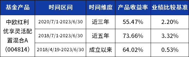 中欧红利优享灵活配置混合A的成立以来涨跌幅64.02%, 同期业绩比较基准0.53%。2018-2022年基金涨跌幅和同期基准表现为-21.66%/-14.89%,43.27%/17.48%,25.77%/7.24%,27.63%/7.58%,-10.2%/-12%。历任基金经理:蓝小康20180420-管理至今,曹名长20180419-20210210,卢博森20180419-20200529。本产品于2020/10 修改投资范围,增加存托凭证为投资标的。详阅法律文件。业绩比较基准为中证沪港深高股息精选指数收益率*80%+中债综合指数收益率*20%。中欧红利优享灵活配置混合A为混合型基金,其预期收益及预期风险水平高于债券型基金和货币市场基金,但低于股票型基金。本基金可投资于港股通标的股票。除了需要承担与内地证券投资基金类似的市场波动风险等一般投资风险之外,本基金还面临港股通机制下因投资环境、投资标的、市场制度以及交易规则等差异带来的特有风险。
