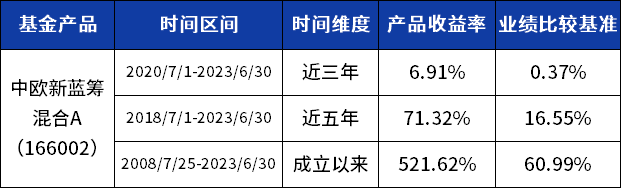 中欧新蓝筹混合A的成立以来涨跌幅521.62%, 同期业绩比较基准60.99%。2018-2022年基金涨跌幅和同期基准表现为-18.33%/-13.91%,59.13%/22.76%,42.77%/17.81%,3.39%/-1.27%,-13.93%/-12.03%。历任基金经理:冯炉丹20211014-管理至今,金媛媛20180827-20200922,林英睿20150529-20160617,周蔚文20110523-管理至今,沈洋20090624-20110523,刘杰文20080725-20090924。本产品于2020/10 修改投资范围,增加存托凭证为投资标的。详阅法律文件。业绩比较基准为沪深300指数*60%+上证国债指数*35%+一年期定期存款利率*5%。中欧新蓝筹混合A为混合型基金,其预期收益及预期风险水平高于债券型基金和货币市场基金,但低于股票型基金。