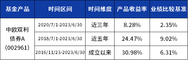 中欧双利债券A的成立以来涨跌幅30.98%, 同期业绩比较基准6.31%。2018-2022年基金涨跌幅和同期基准表现为2.5%/1.51%,8.25%/4.53%,11.52%/2.62%,3.56%/1.5%,-4.38%/-1.78%。历任基金经理:蒋雯文20180130-20220701,黄华20170405-管理至今,张跃鹏20161123-20180601。本产品于2020/10修改投资范围,增加存托凭证为投资标的。详阅法律文件。业绩比较基准为中债综合指数收益率*90%+沪深300指数收益率*10%。中欧双利债券A为债券型基金,其预期收益及预期风险水平高于货币市场基金,但低于混合型基金、股票型基金。