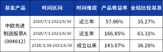中欧先进制造股票A的成立以来涨跌幅143.07%, 同期业绩比较基准38.20%。2018-2022年基金涨跌幅和同期基准表现为-19.73%/-27.6%,49.03%/28.9%,125.66%/58.15%,31.99%/33.92%,-24.58%/-25.03%。历任基金经理:卢纯青20200624-管理至今,于浩成20180119-20200624。本产品于2020/10 修改投资范围,增加存托凭证为投资标的。详阅法律文件。业绩比较基准为中证新能源指数收益率*60%+中证高端装备制造指数收益率*20%+中证港股通工业综合指数收益率*10%+中证短债指数收益率*10%。中欧先进制造股票A为股票型基金,其预期收益及预期风险水平高于债券型基金、货币市场基金和混合型基金。本基金可投资于港股通标的股票。除了需要承担与内地证券投资基金类似的市场波动风险等一般投资风险之外,本基金还面临港股通机制下因投资环境、投资标的、市场制度以及交易规则等差异带来的特有风险。本基金为主题型基金,业绩波动可能较大。